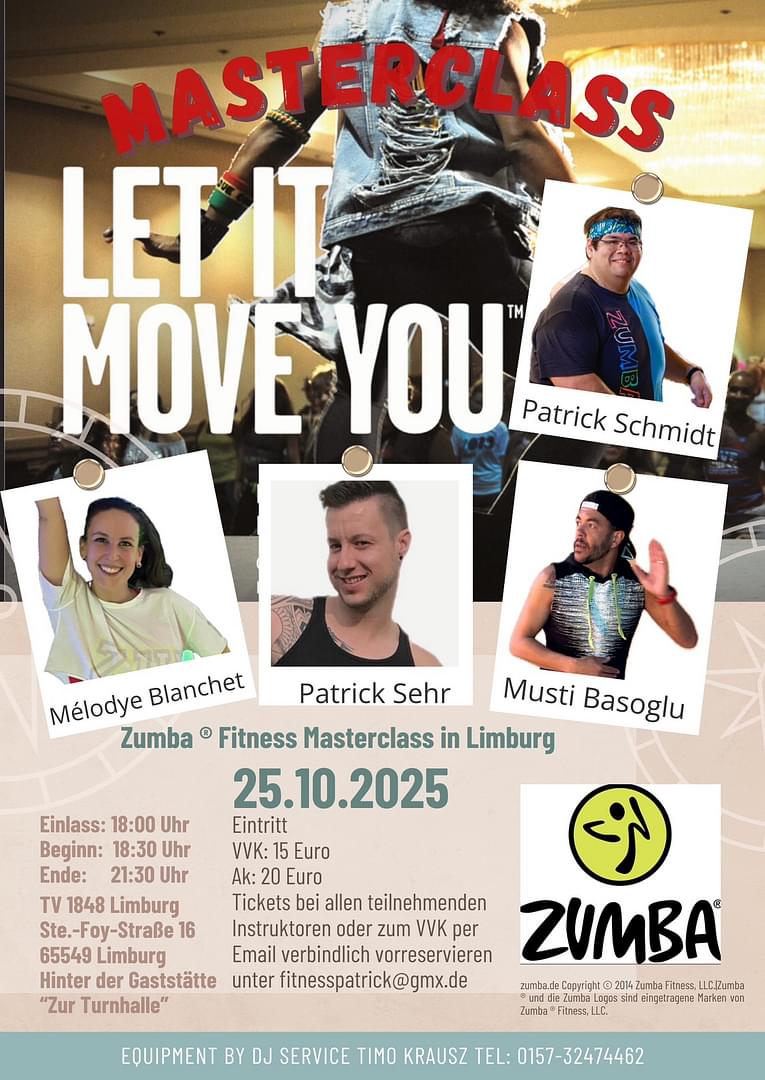 Endlich ist es wieder soweit!!! Zumba® Fitness Das wird ein geiles Event! Mit dabei sind Melodye, Musti und 2x Patrick. Tickets verbindlich reservieren zum VVK per Email an [email protected] Zu den Veranstaltungsdetails: Tickets sind begrenzt. Also seid schnell Wann steigt die Party? Am 25.10.2025 von 18:30 Uhr- 21:30 Uhr Einlass ist ab 18 Uhr. Wo läuft die geilste Musik? Ste.-Foy-Straße 16 65549 Limburg an der Lahn Hinter der Gaststätte "zur Turnhalle"