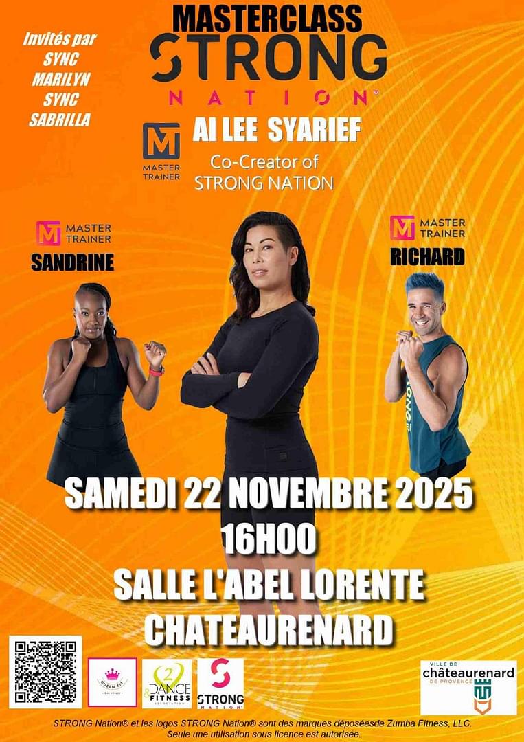 Masterclass STRONG NATION pour la première fois sur AVIGNON le 22 novembre 2025 à 16h00 salle L'ABEL LORENTE à CHATEAURENARD Avec AI LEE SYARIEF co-créatrice et lead Master Trainer de STRONG NATION, RICHARD GORMLEY MT FRANCE et SANDRINE LOPY MT FRANCE.