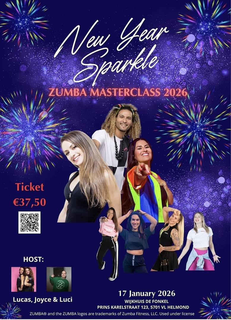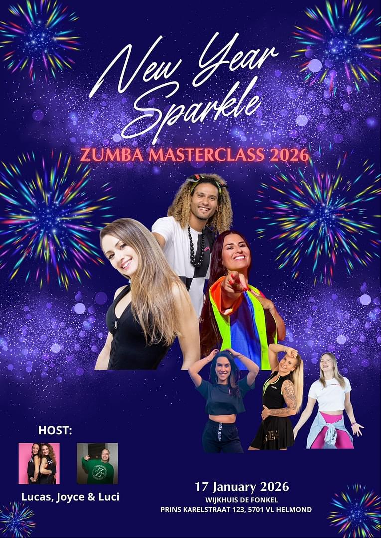 Zumba® Masterclass New Year Sparkle 2026!! This time with Lina Telis, Bechir Ben Dhief and Victoria Wanders for the first time together on the stage in the Netherlands a ZUMBA MASTERCLASS® you just don’t want to miss! During the day there will be a ZIN JAM™SESSION to join in! More information coming soon! Ticket sale: Regular Ticket - €37,50,- included in your ticket, Snack and drink. https://eventix.shop/t45teva9 HOST: ZIN™ - Lucas Rafla, ZIN™ Luz Maria Avila Lama