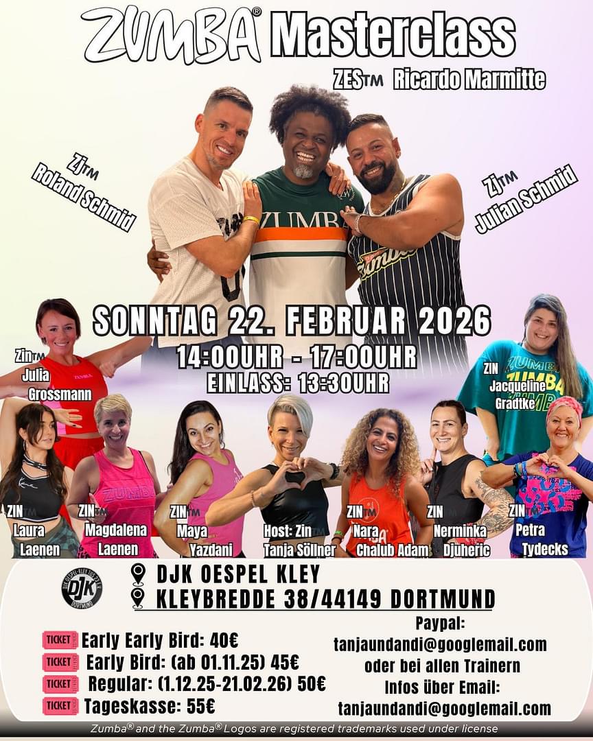 🤩✨ Zum ersten Mal 💖ZES™ Ricardo Marmitte bei uns in Dortmund! 💃🔥 Freut euch auf das großartige Trio 💛 ZES™️ Ricardo Marmitte, ZJ™️ Roland Schmid, ZJ™️ Julian Schmid 💛 und ein fantastisches Instruktoren-Team! 🌟 Mega Location, mega Sound – viel Platz zum Tanzen, Feiern
