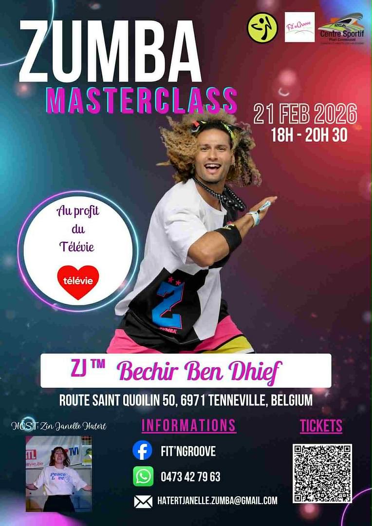 Join us for an evening full of energy, music, and solidarity in support of Télévie! After two successful editions, we’re back for a third one that’s even more festive and generous, open to everyone – young and old, beginners and experienced dancers alike! This year, we have the great honor of welcoming Bechir Ben Dhief, a Dutch Zumba Jammer, known for his boundless energy and contagious good vibes 💥 We’ll also be joined by passionate instructors from Belgium and Luxembourg 🥰 ⸻ 🕺 Program Zumba Gold: 4:30 PM – 5:30 PM Zumba Masterclass with Bechir: 6:00 PM – 8:30 PM