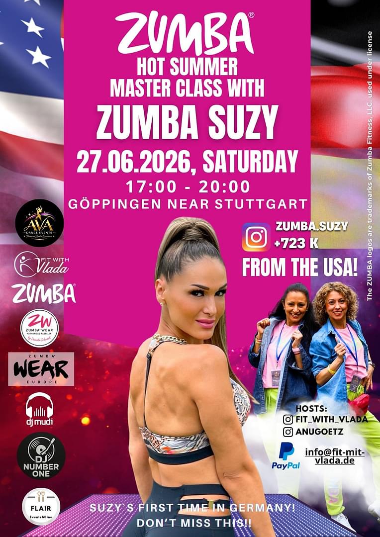 Our summer is getting hot – and we’re bringing the USA vibe straight to Göppingen near Stuttgart (Germany)! Experience a high-energy ZUMBA® Hot Summer Master Class with international presenter ZUMBA Suzy – full of passion, dynamics and an unforgettable stage presence!