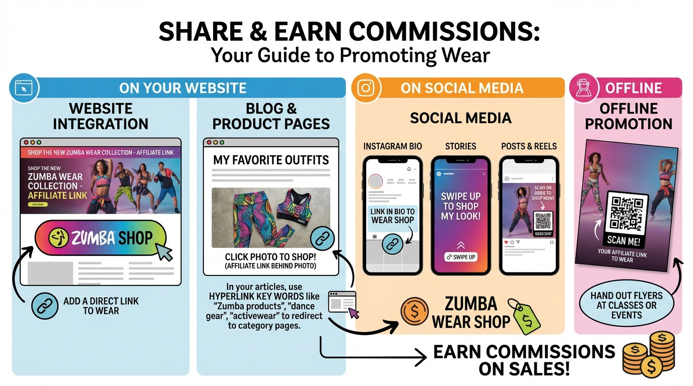 Website Integration: Add a direct affiliate link or banner to your homepage, shop page, or Zumba/fitness content areas. Feature the latest Zumba Wear collections and encourage your visitors to shop through your link.