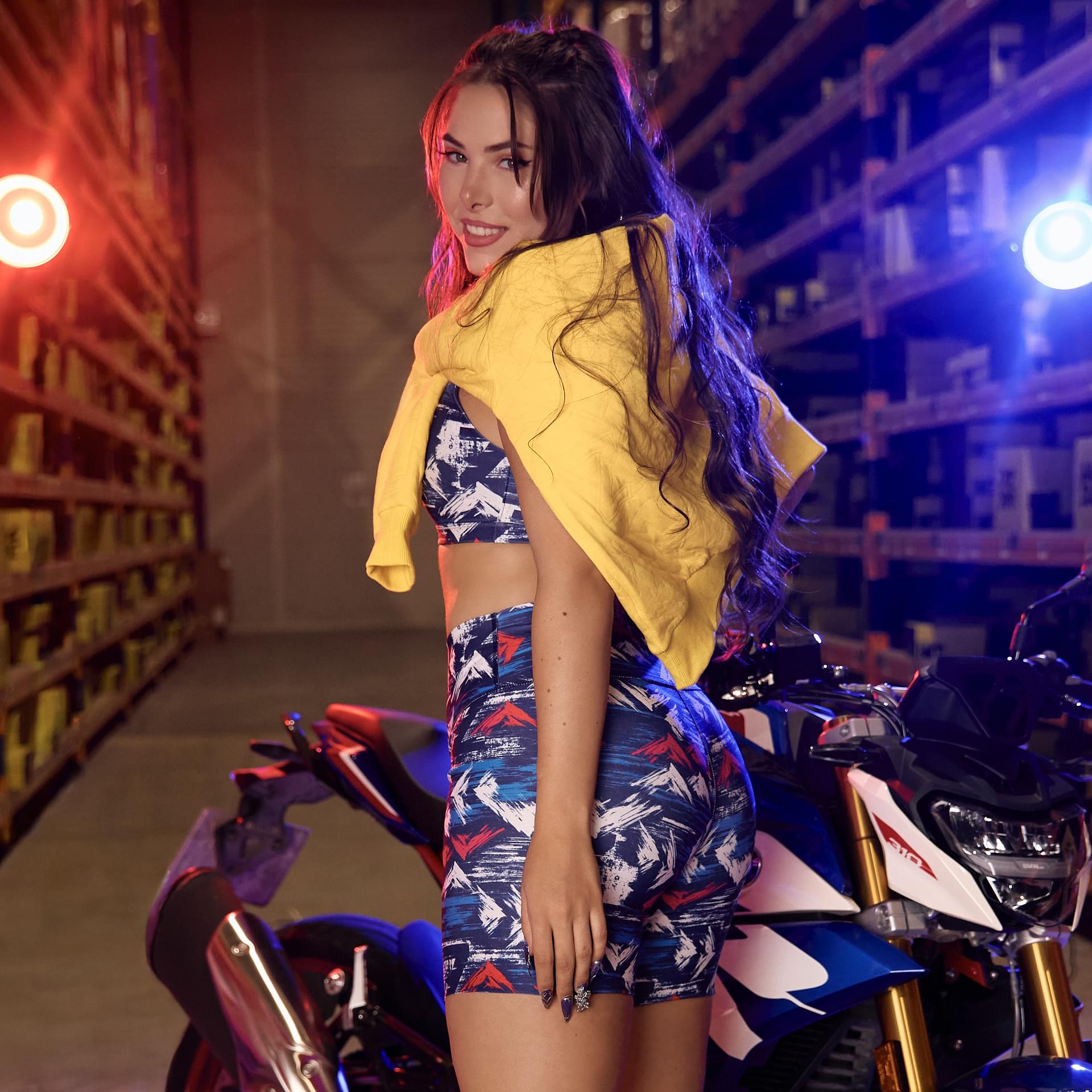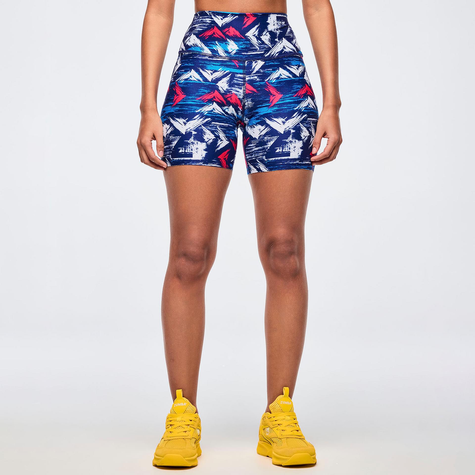 Experience the perfect blend of style and functionality with the Apres Zumba High Waisted Biker Shorts in a vibrant blue and white design.