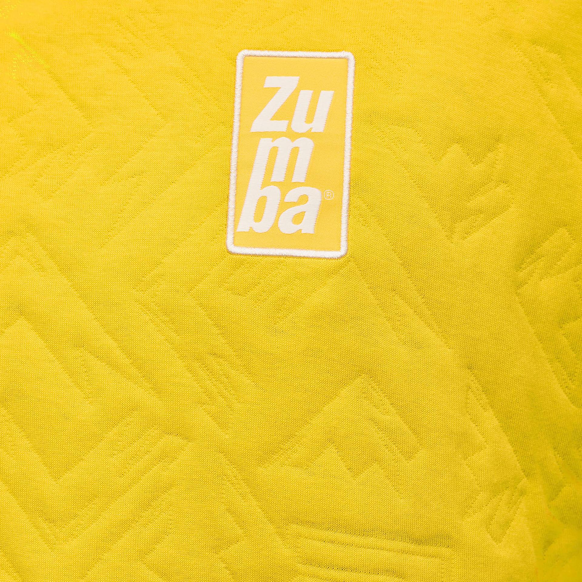Attention to detail is evident in the rib knit collar, cuffs, and bottom band, which not only enhance the overall aesthetic but also ensure a snug fit that retains its shape. The branded woven patch with an embroidered edge serves as a subtle yet stylish nod to the Zumba brand, making it a perfect addition to any activewear collection.