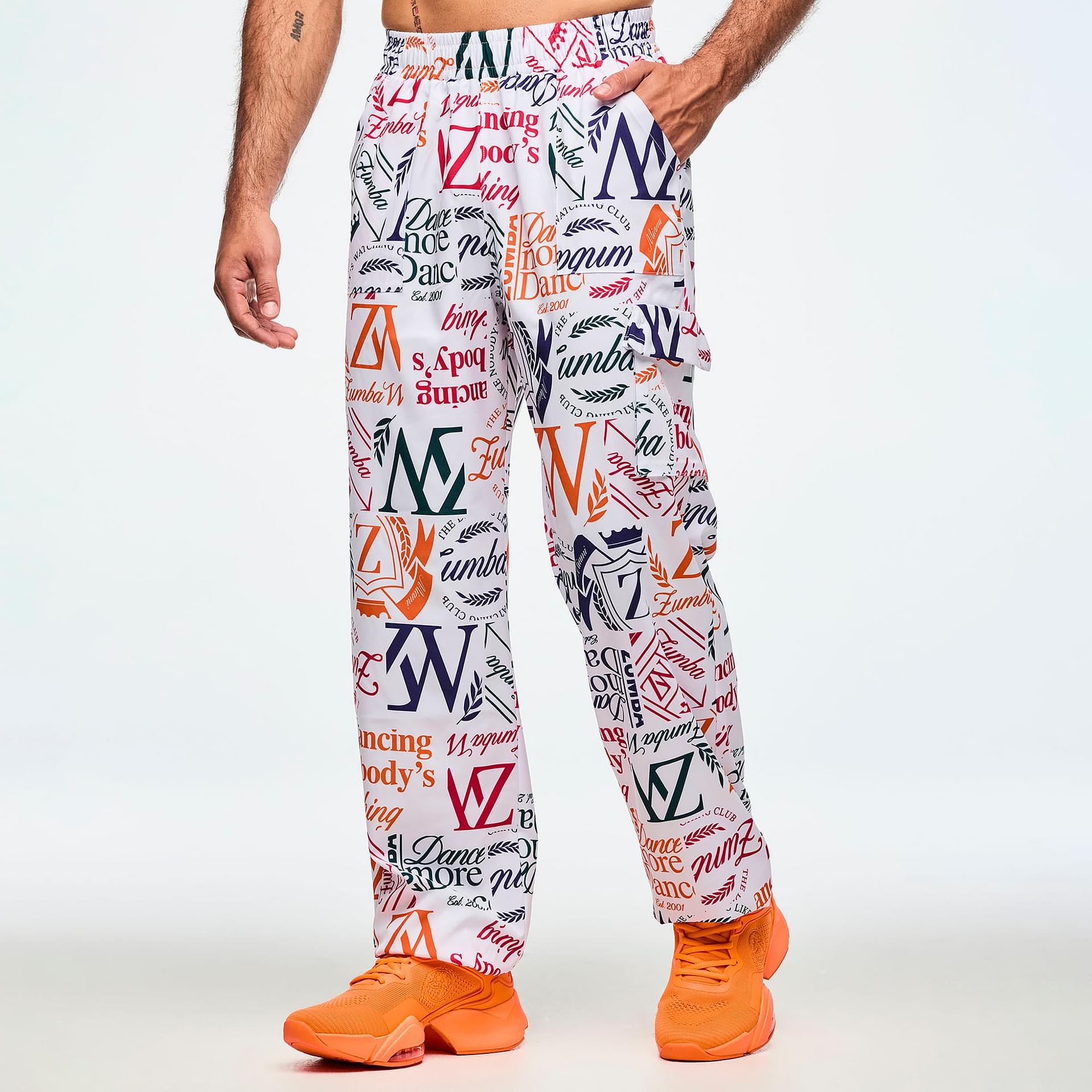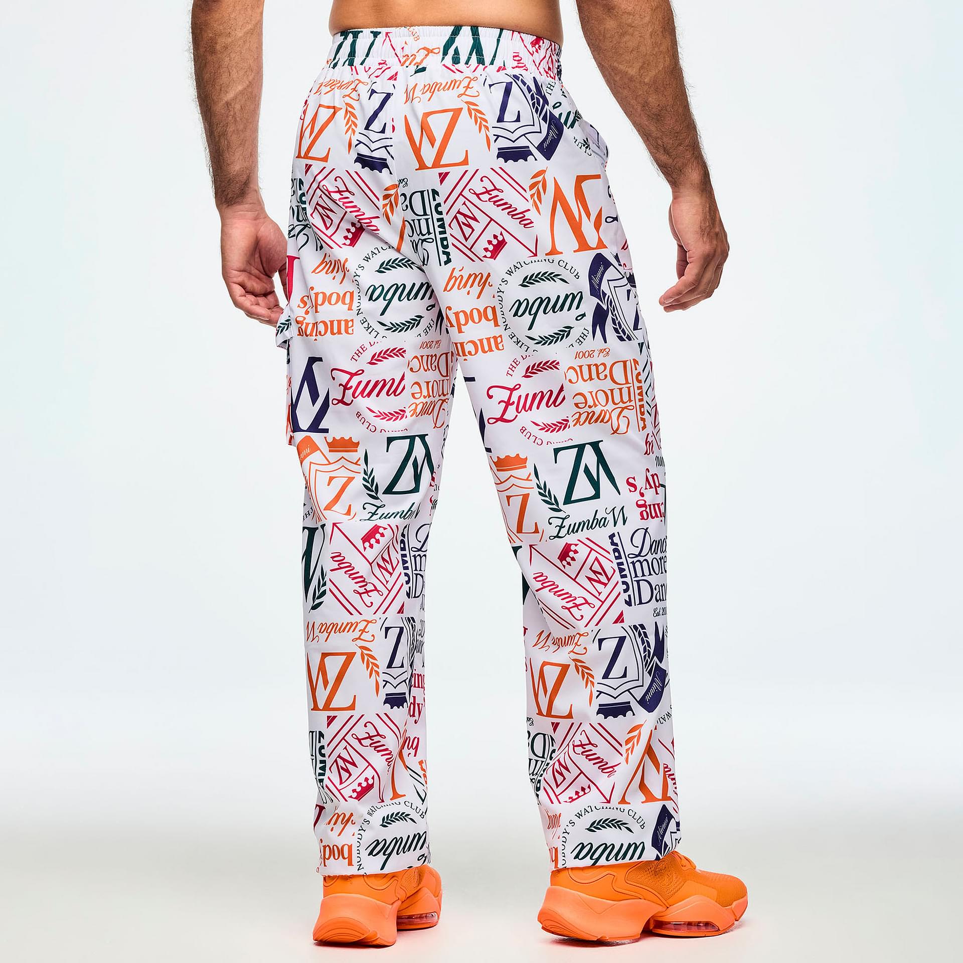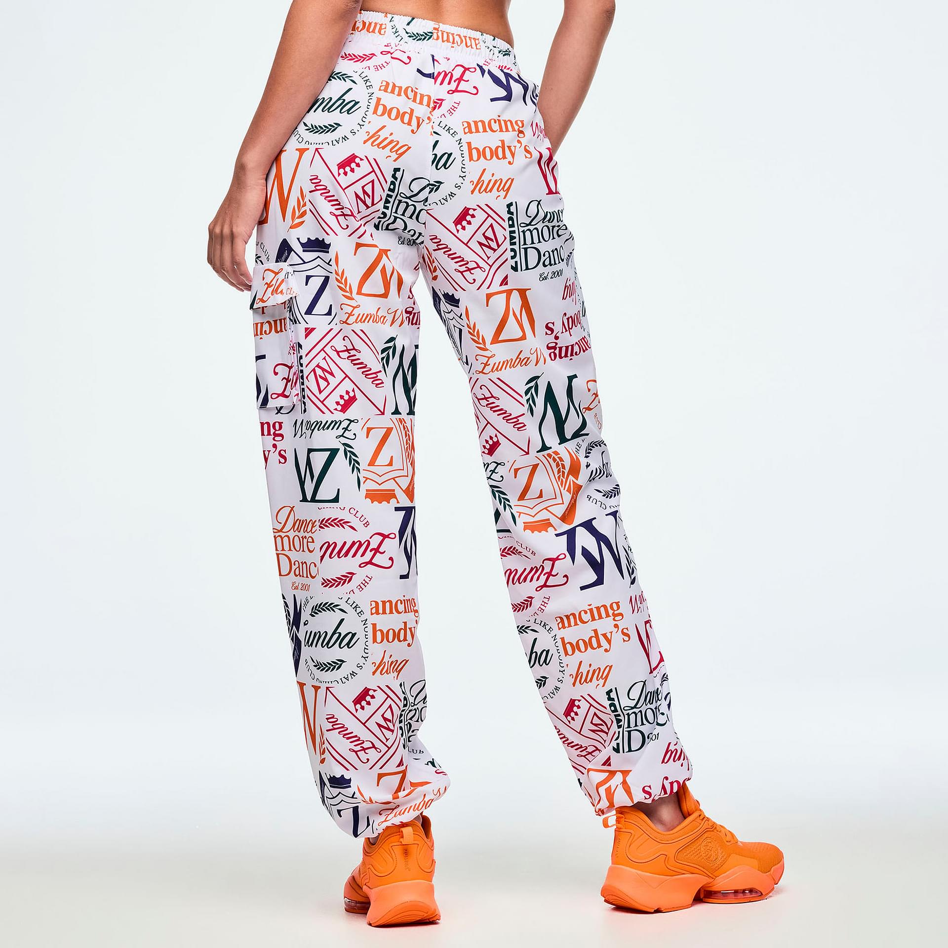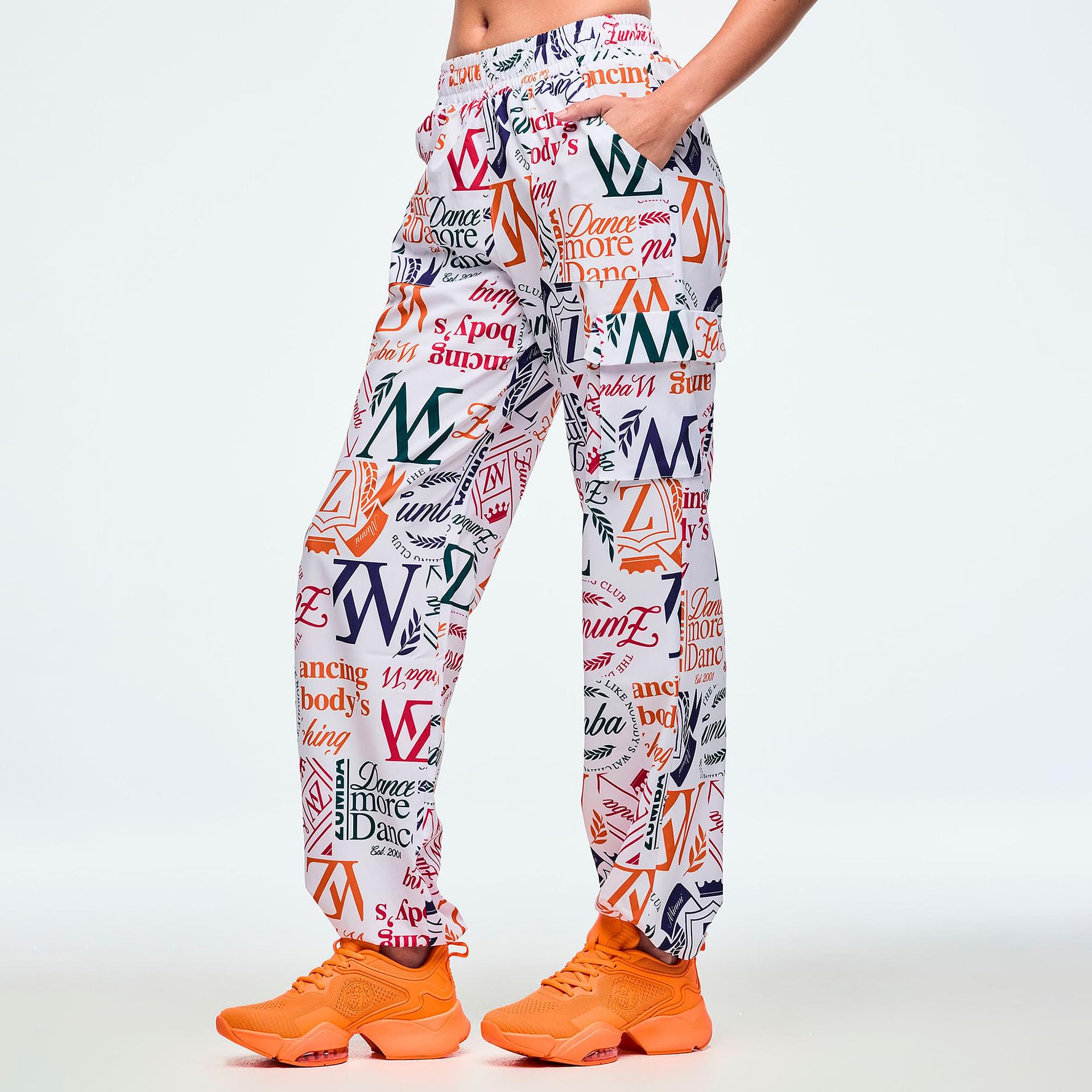 Functionality is at the forefront of this design, featuring front patch pockets on the upper body for convenient storage of essentials. The Zumba-exclusive all-over print adds a vibrant touch, making these cargo pants not just a piece of clothing, but a statement of individuality and style. Whether you're heading to a dance class or enjoying a casual day out, these pants are your perfect companion, combining practicality with a flair for fashion.