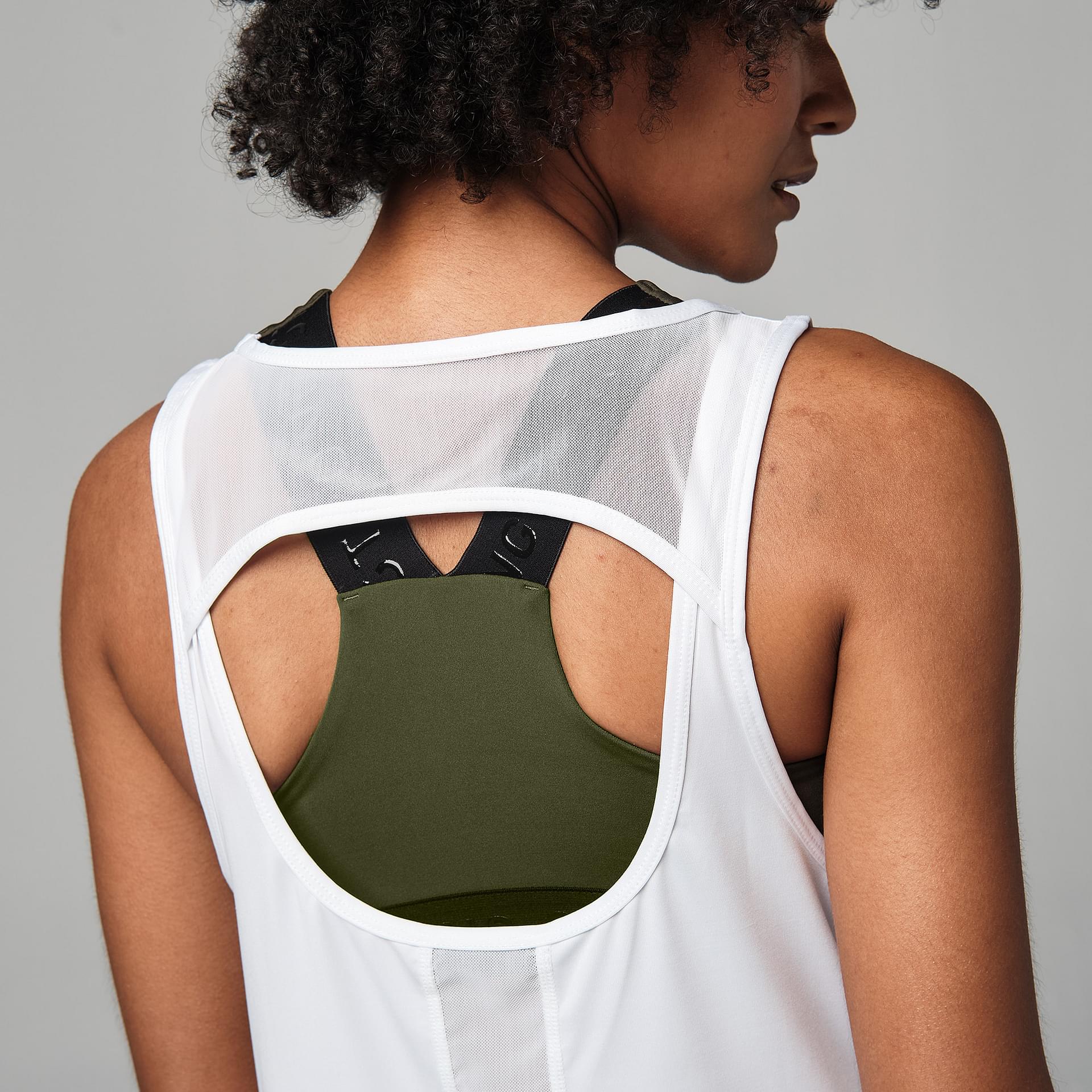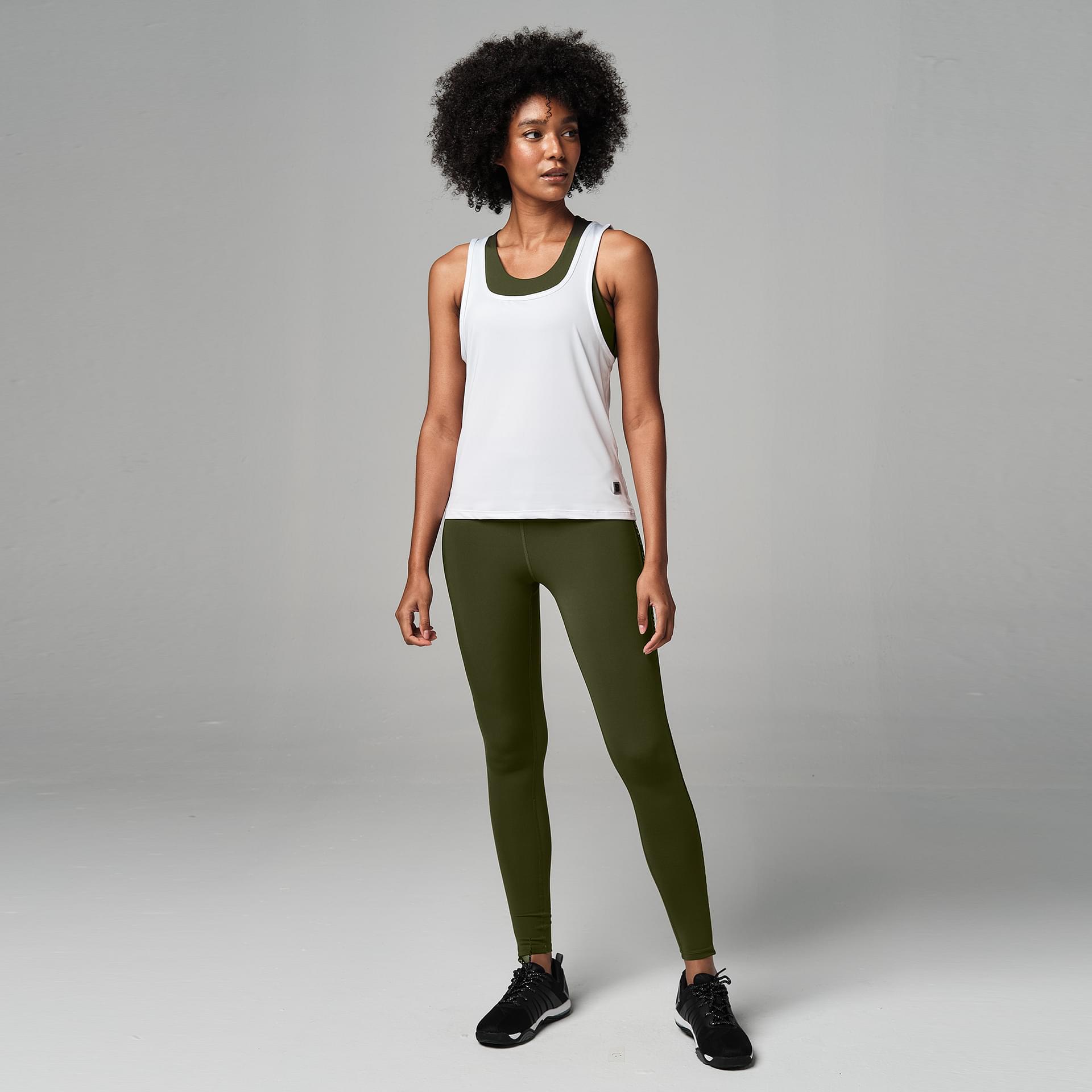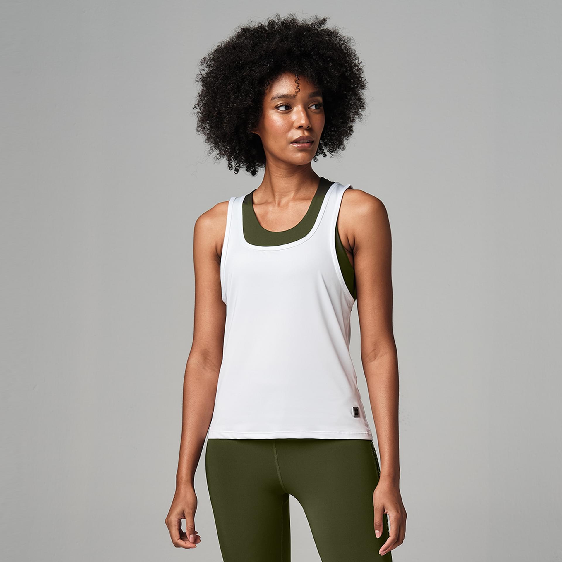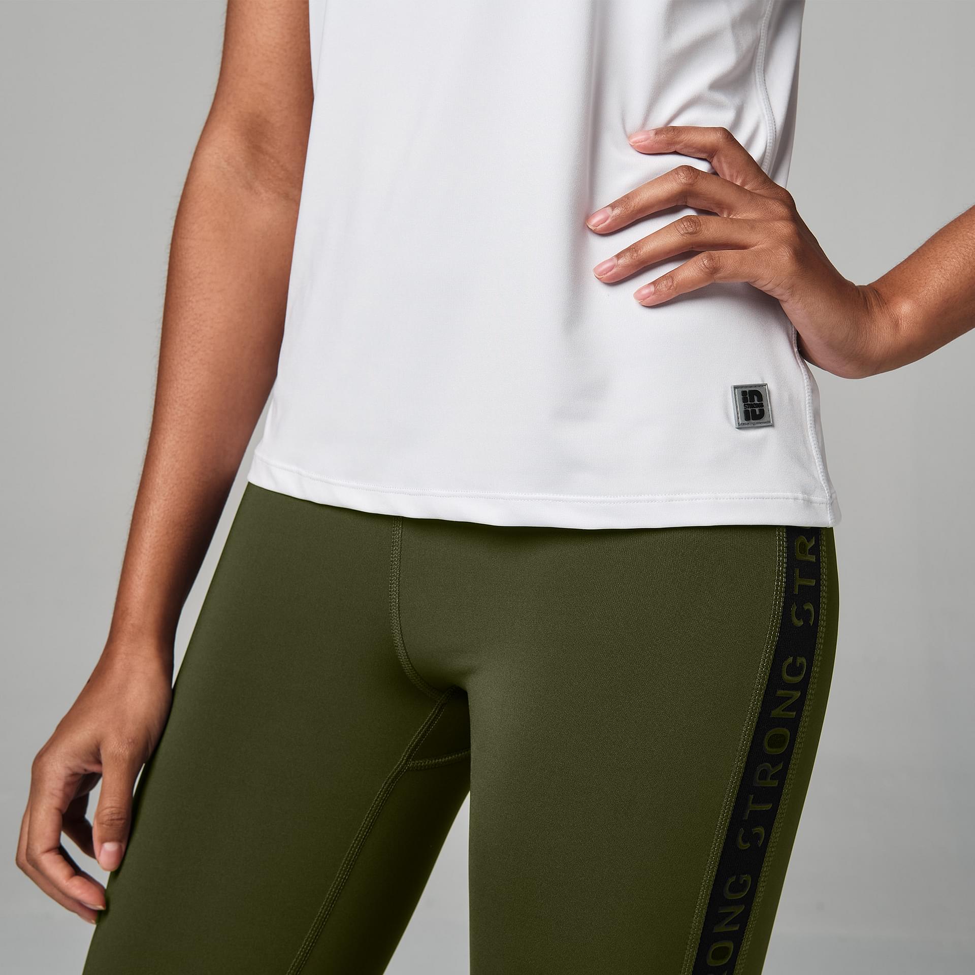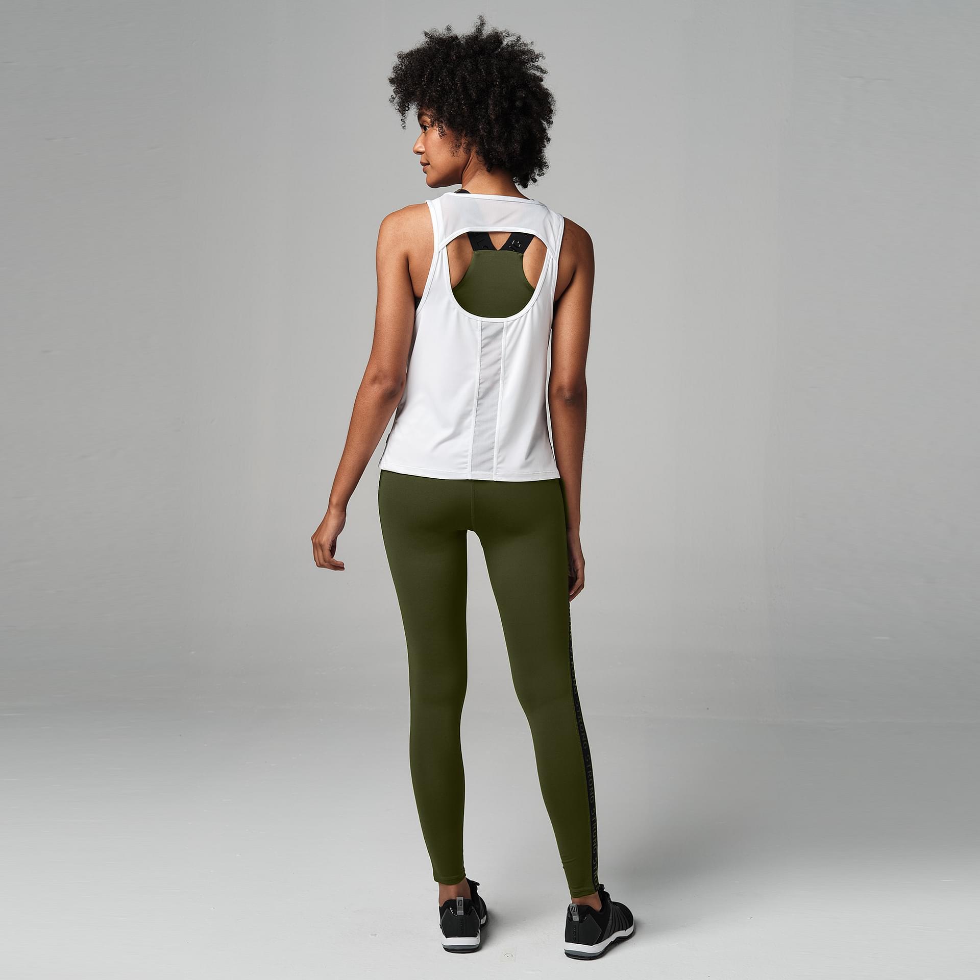 This piece is a easy fit, regular length with a Cut out back detail tank. It has breathable Mesh inserts & reflective logo patch. The sweat wicking fabric leaves you dry through your class. Available in WHite color.