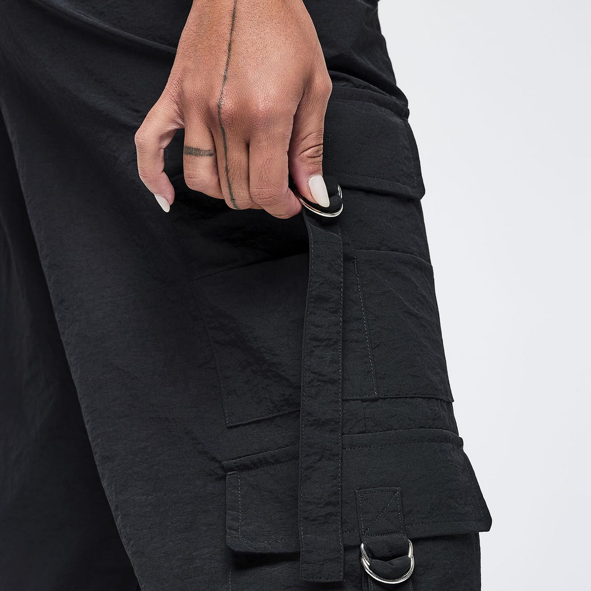 Functionality meets fashion with thoughtfully designed side cargo pockets on each leg, providing ample space for essentials without compromising on style. The slanted upper pockets add an extra touch of flair, ensuring you have everything you need at your fingertips. Additionally, the functional bungee drawcord at the bottom leg opening allows for customizable styling, giving you the freedom to adjust the fit according to your preference.