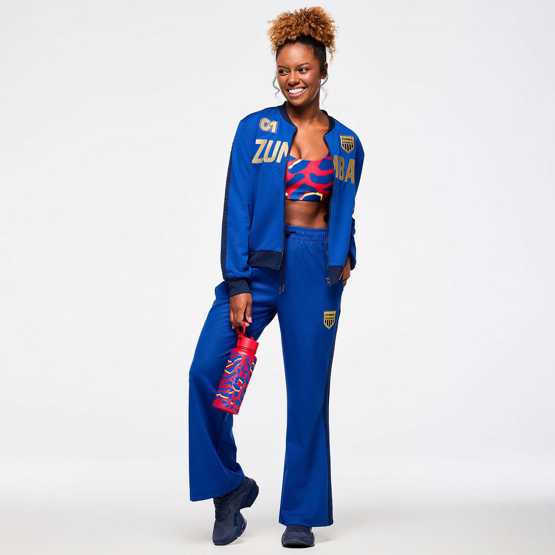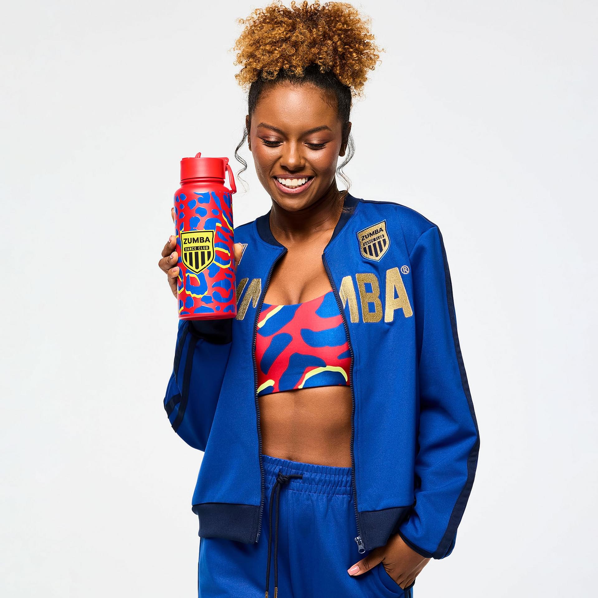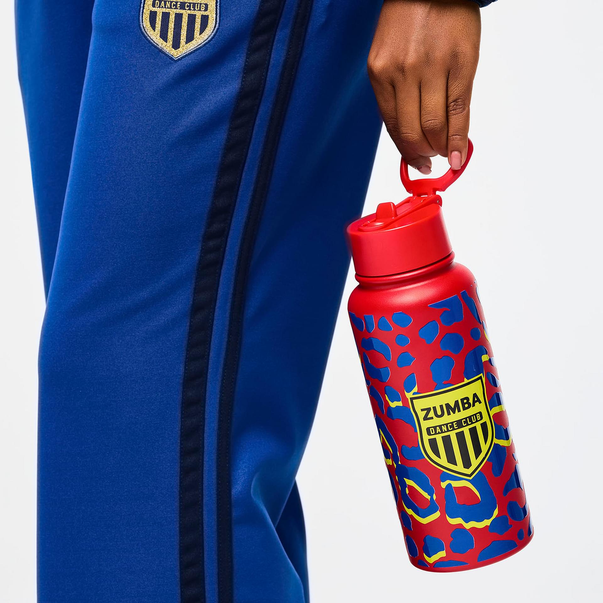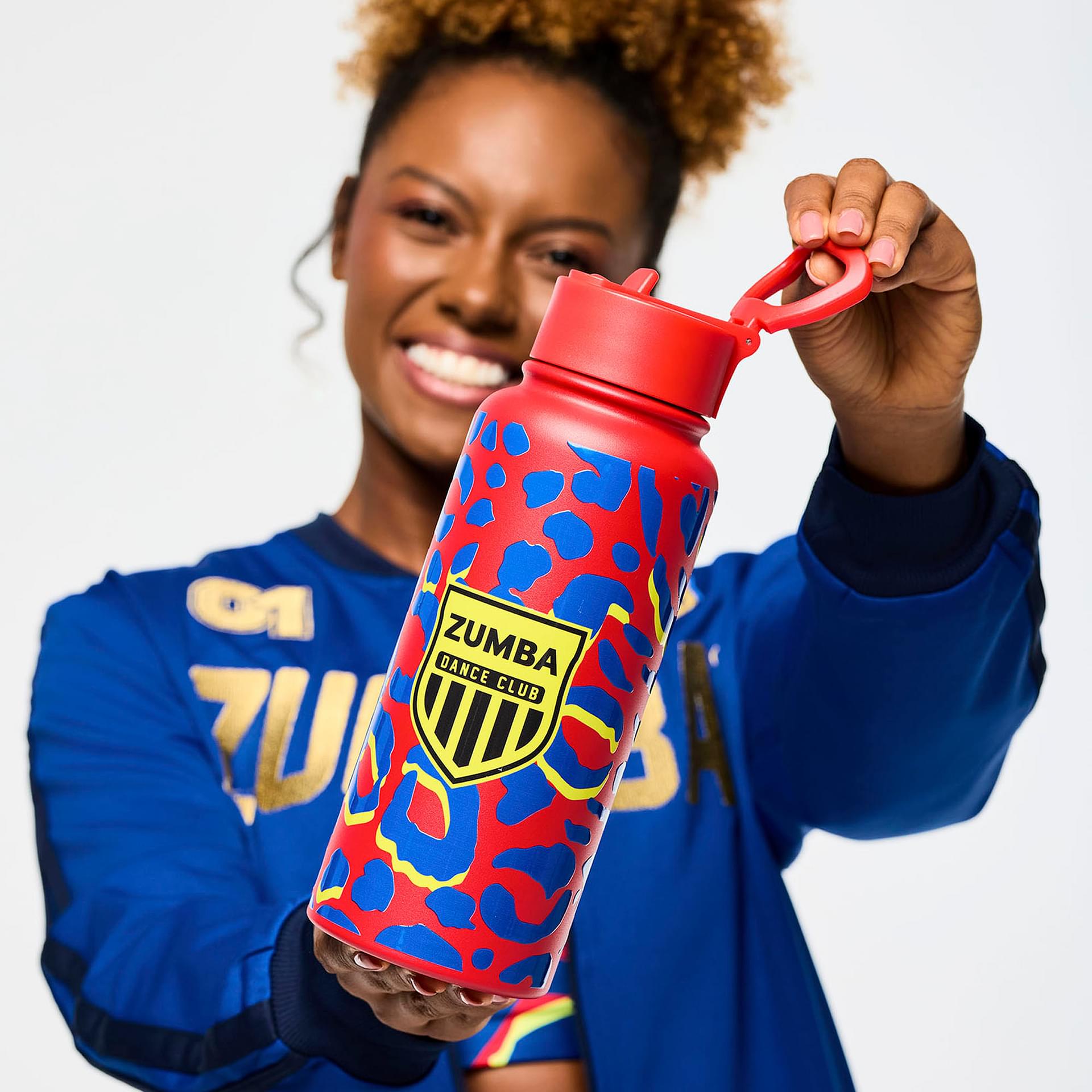 The vibrant red body features a colorful animal print, complemented by the sport-inspired Zumba logo, making it a stylish accessory that stands out in any setting.