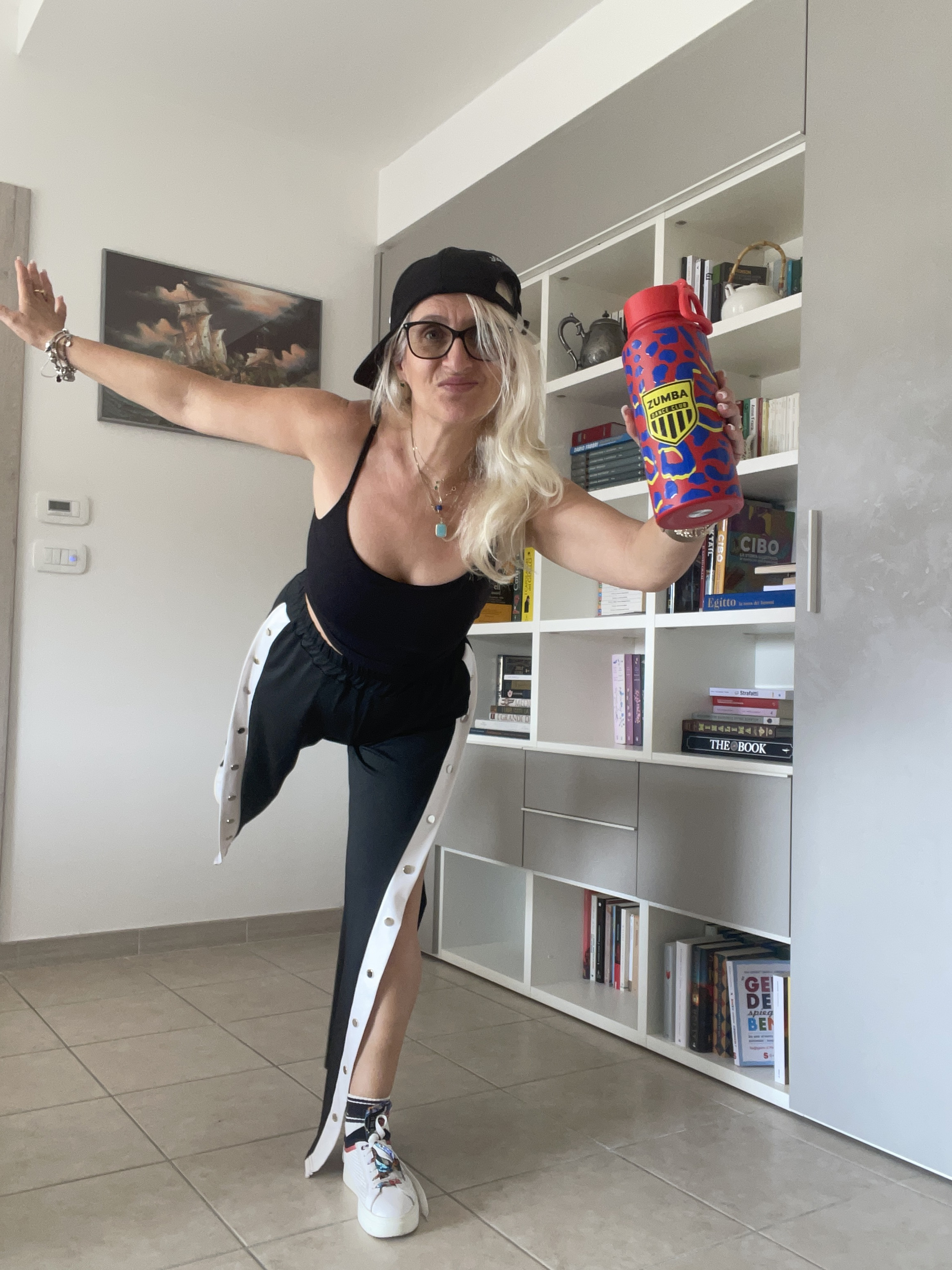 The vibrant red body features a colorful animal print, complemented by the sport-inspired Zumba logo, making it a stylish accessory that stands out in any setting.