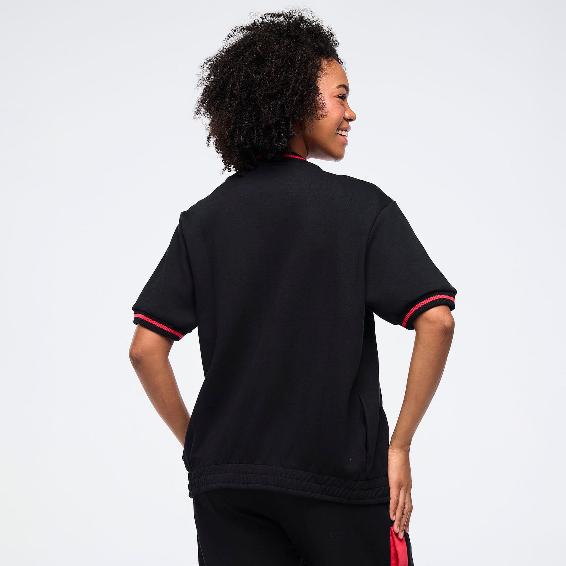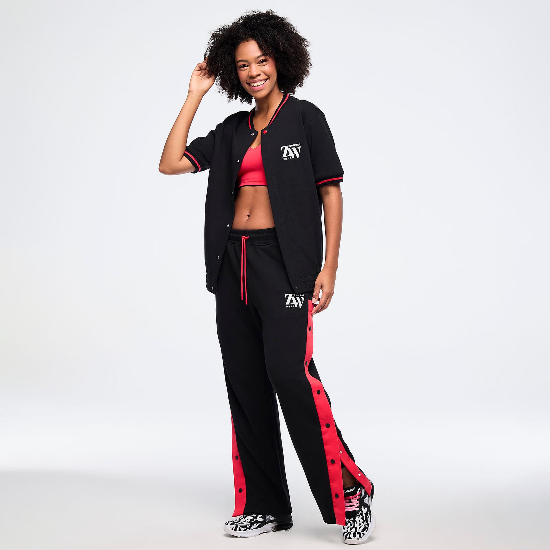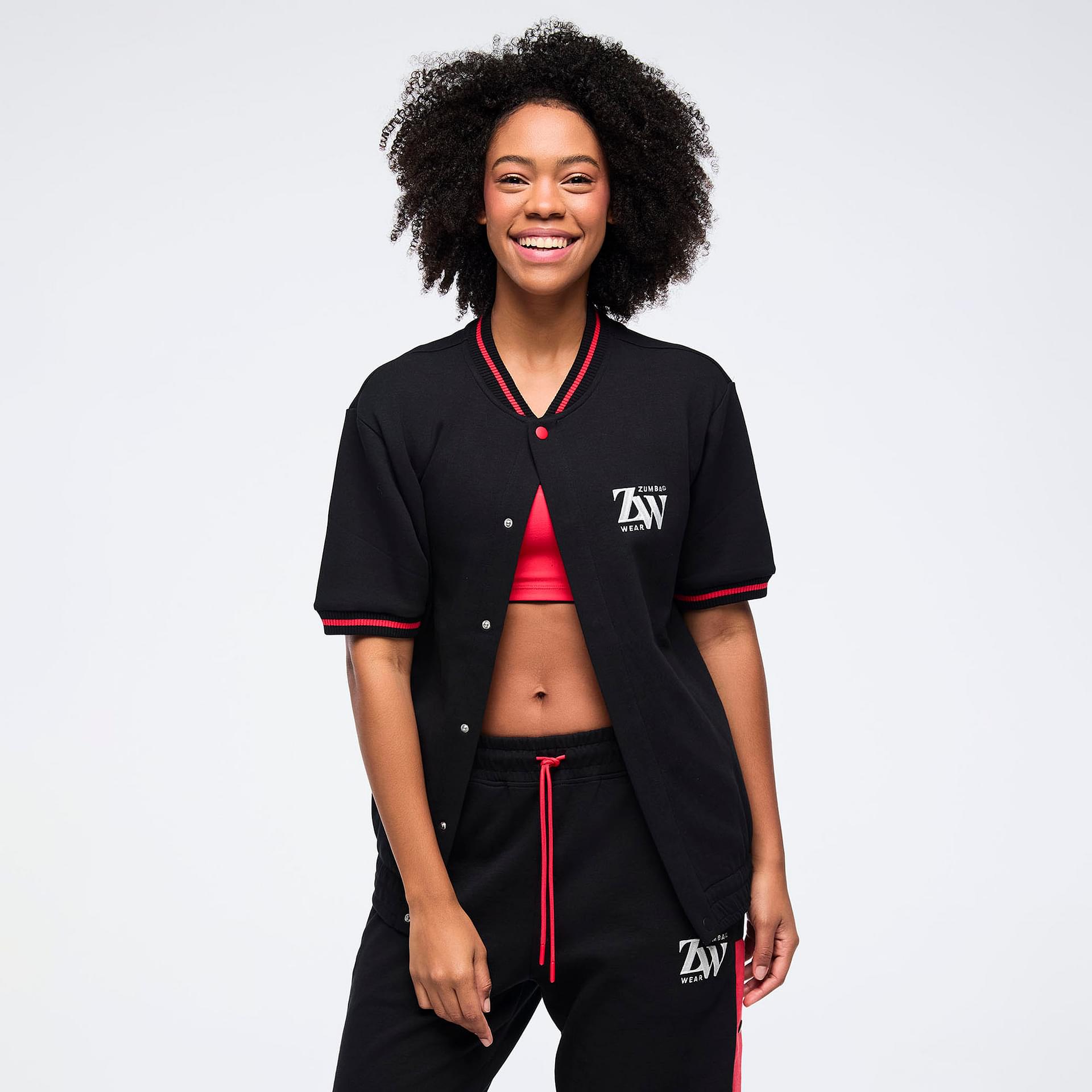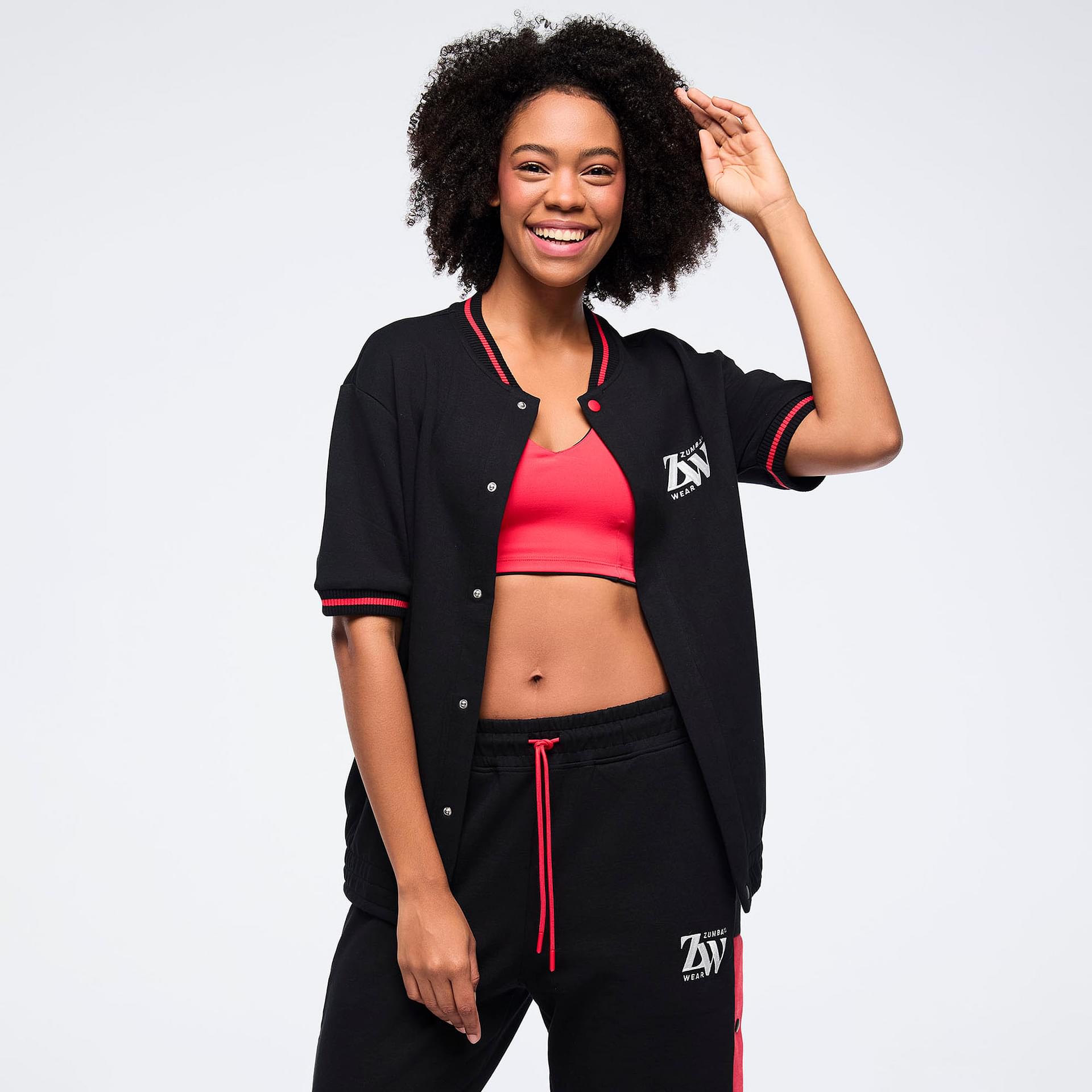 The relaxed fit and long length of this bomber jacket offer a contemporary silhouette that flatters all body types. Striped rib cuffs and a neckband add a sporty flair, while the side seam pockets provide practical storage for your essentials, allowing you to stay hands-free during your activities. The Zumba graphic embroidery on the left chest serves as a bold statement of your passion for fitness and dance, making this jacket not just a piece of clothing but a representation of your vibrant lifestyle.