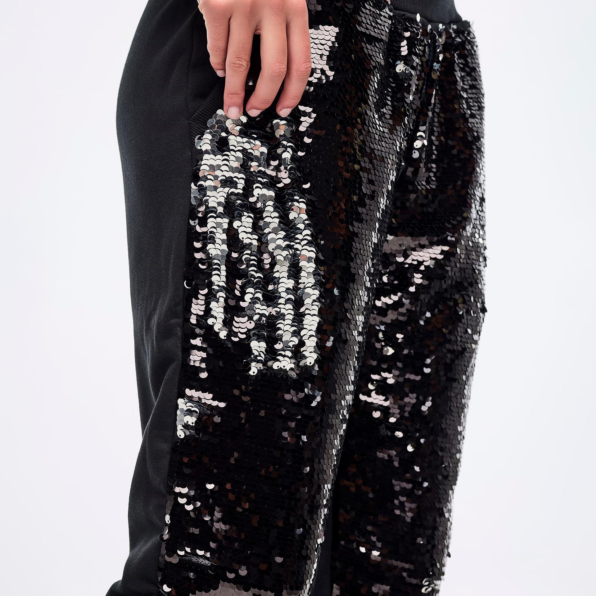 El corte relajado y la longitud hasta el tobillo aseguran una silueta favorecedora, mientras que la entrepierna de 28" (71 cm) permite un estilo versátil. El panel frontal de lentejuelas multidireccional añade un toque juguetón; simplemente empuja hacia abajo para un look negro chic o tira hacia arriba para un efecto plateado deslumbrante. Esta característica no solo realza tu atuendo, sino que también te permite expresar tu estado de ánimo y personalidad sin esfuerzo.