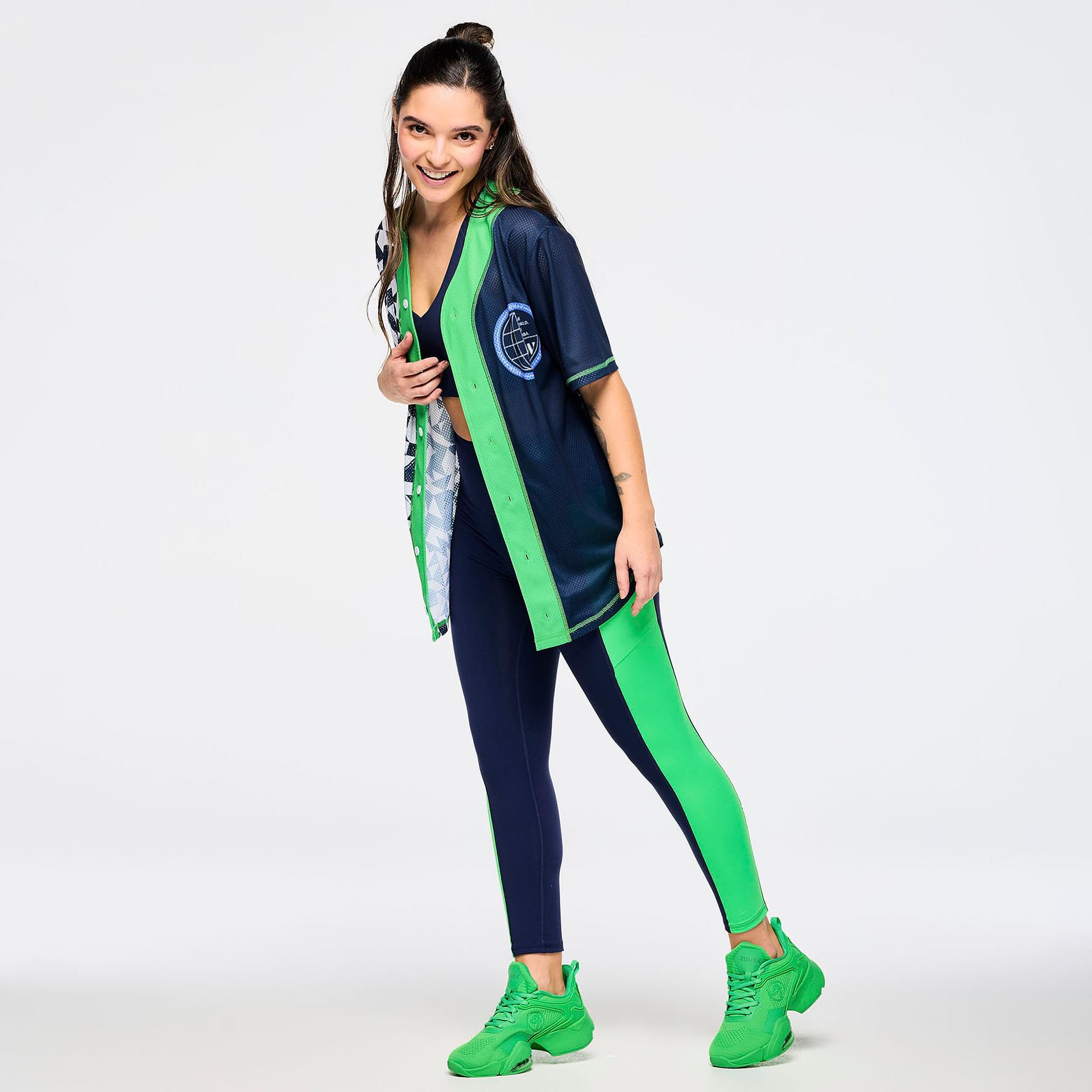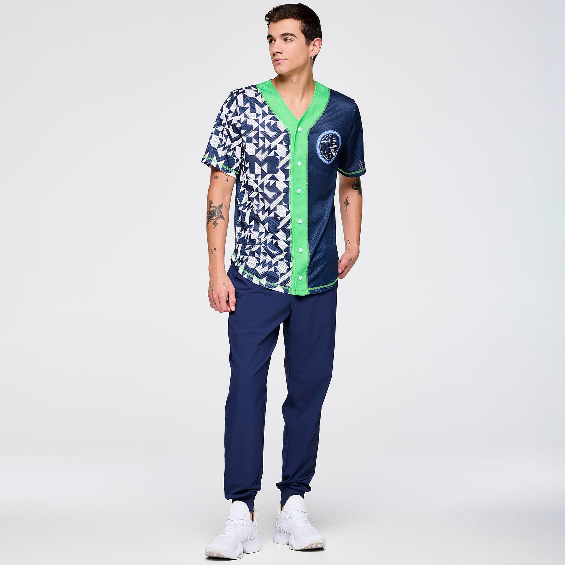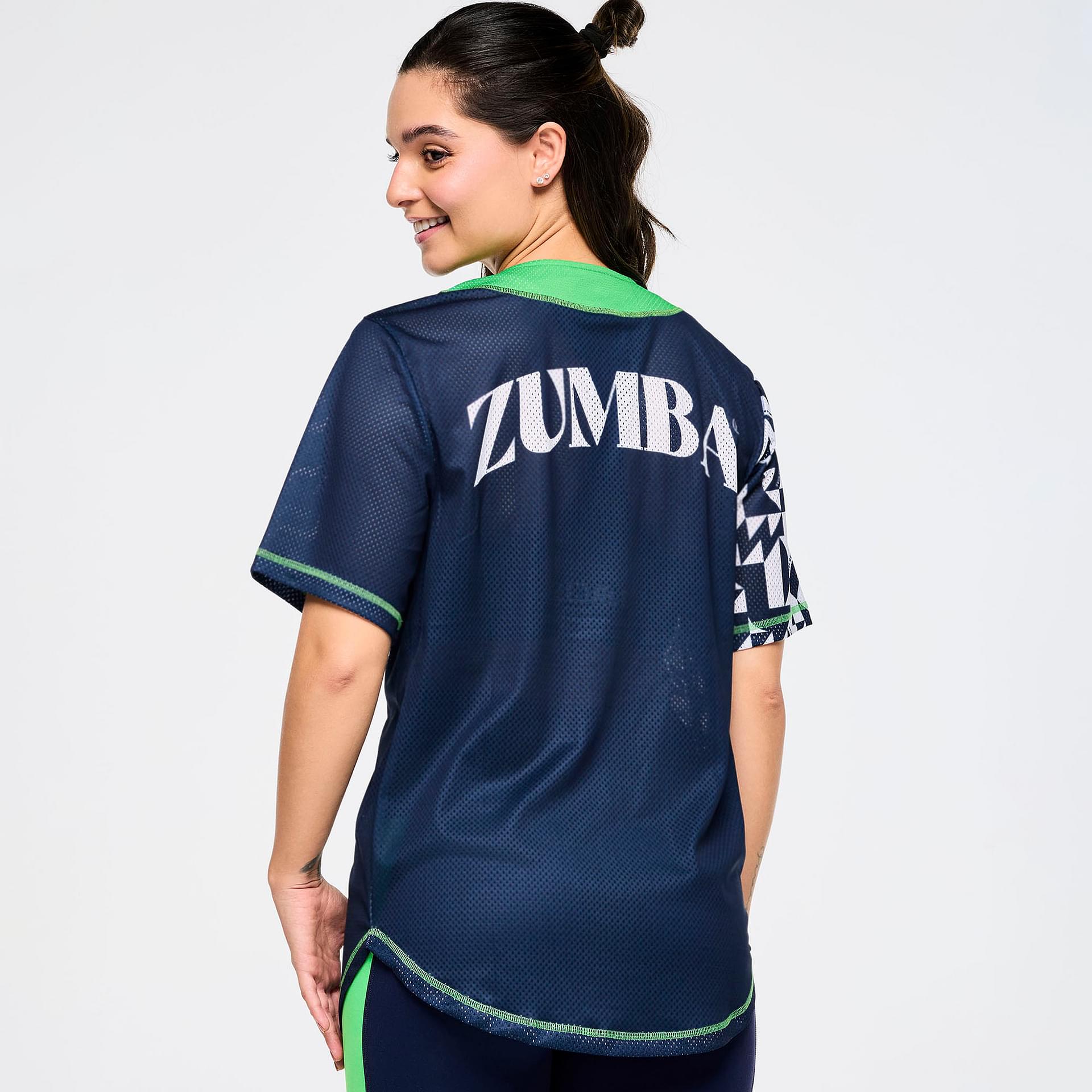 The jersey features a center front placket with buttons, adding a touch of classic baseball style while enhancing ease of wear. The bold geometric Zumba-exclusive all-over print makes a statement, reflecting the vibrant energy of the Zumba community. This eye-catching design is perfect for those who want to express their individuality while staying active.