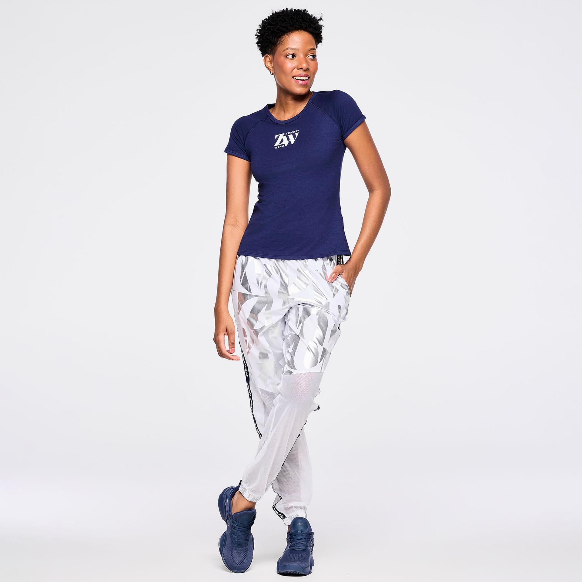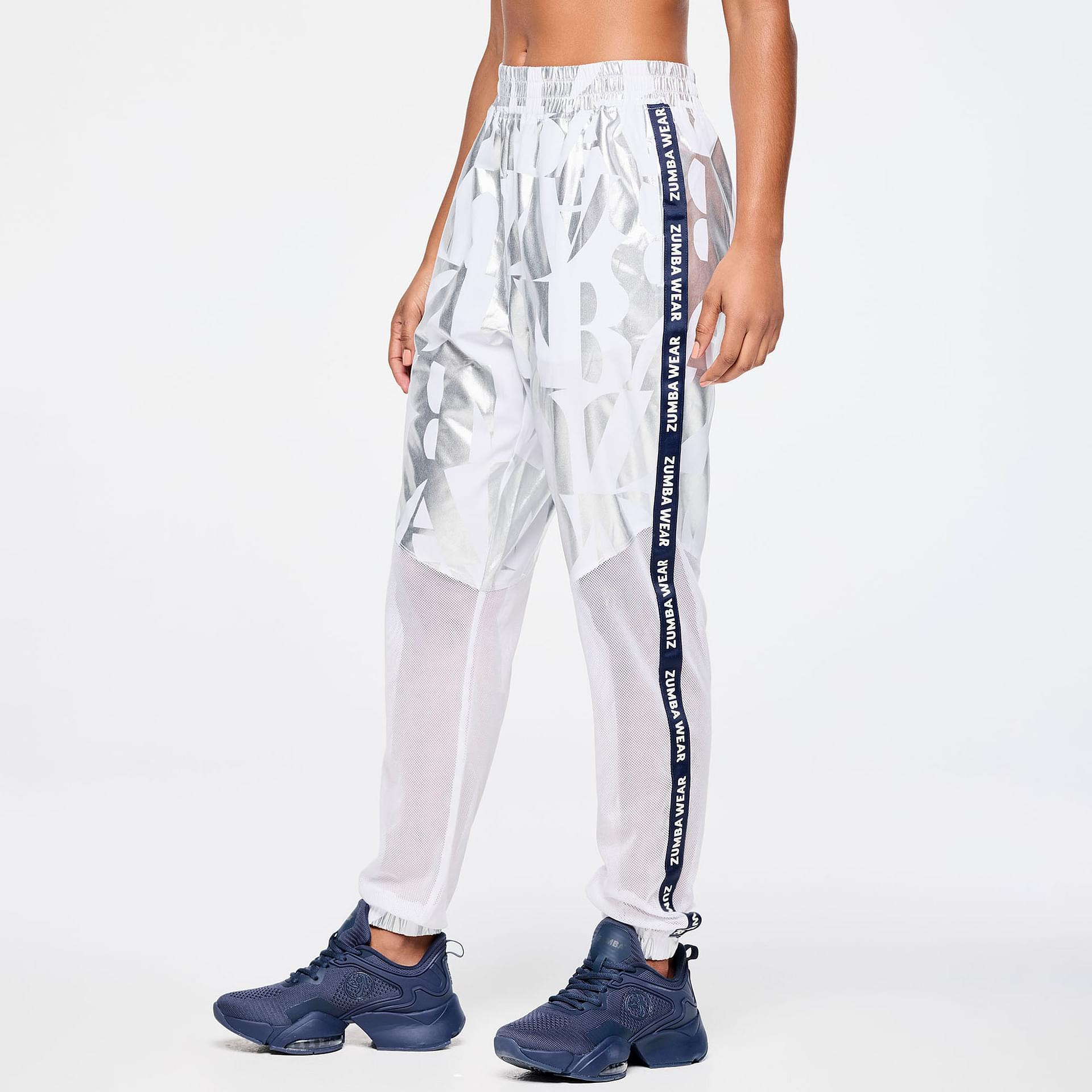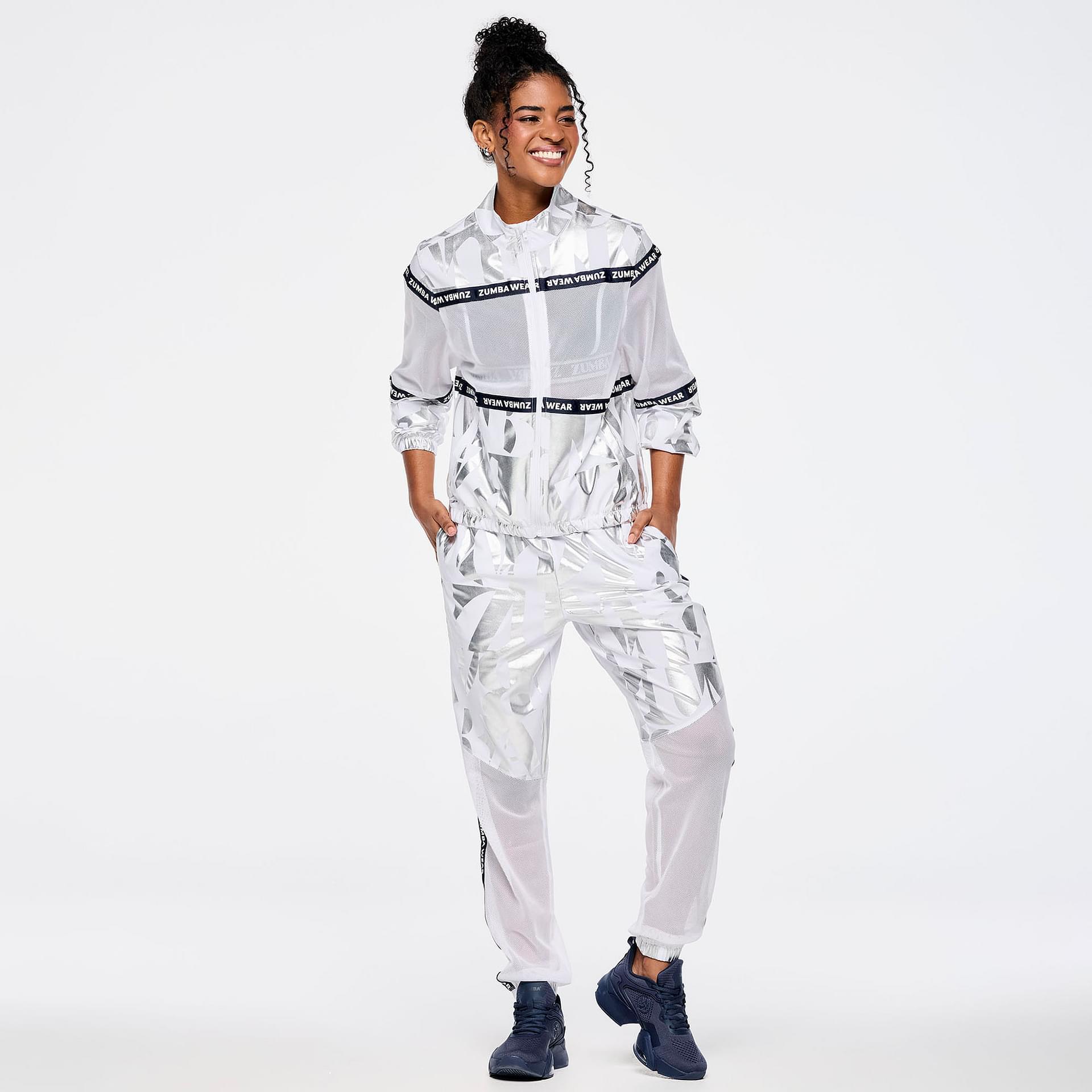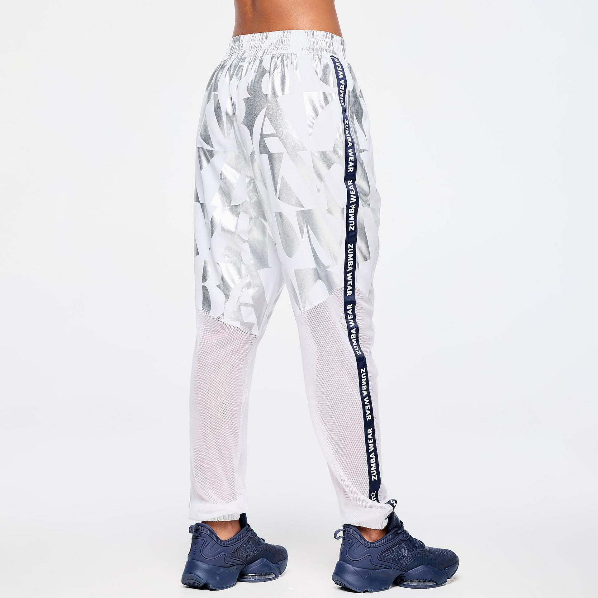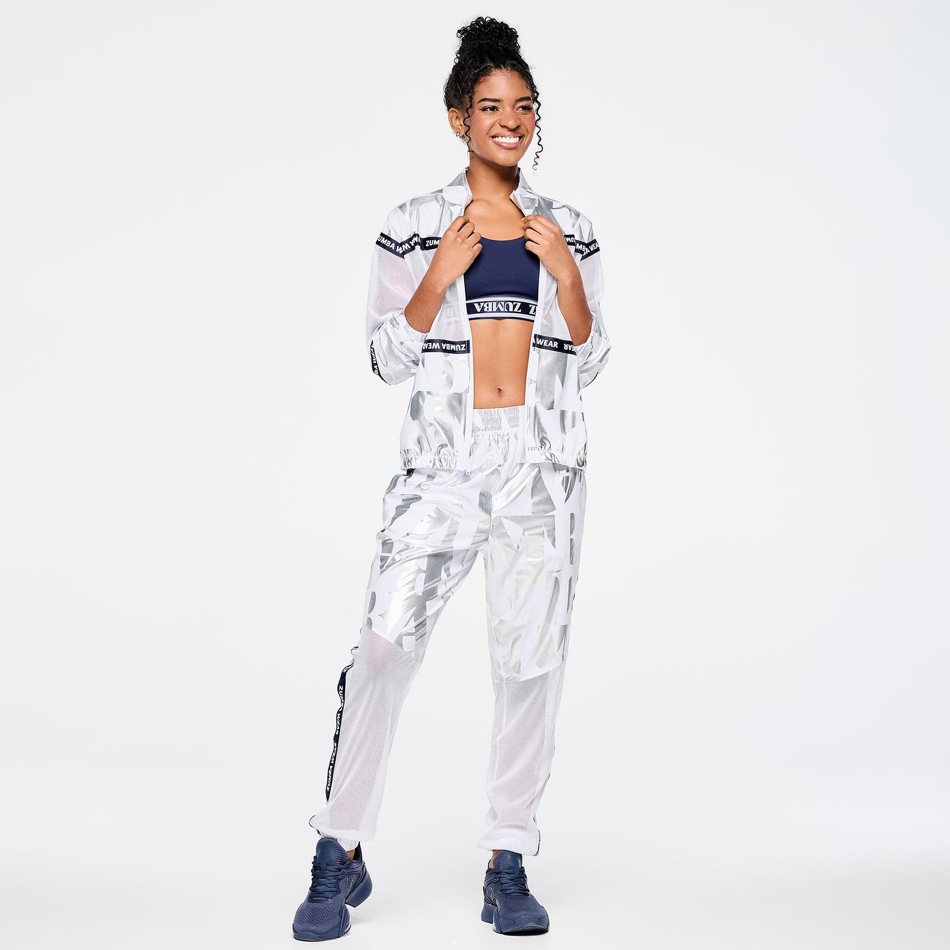 Crafted from a premium woven stretch fabric composed of 90% polyester and 10% spandex, these track pants are engineered to move with you. The lightweight material provides excellent breathability, while the spandex content ensures a snug yet flexible fit. The standout feature is the metallic foil geometric Zumba-exclusive all-over print, which adds a touch of flair and individuality to your activewear collection.