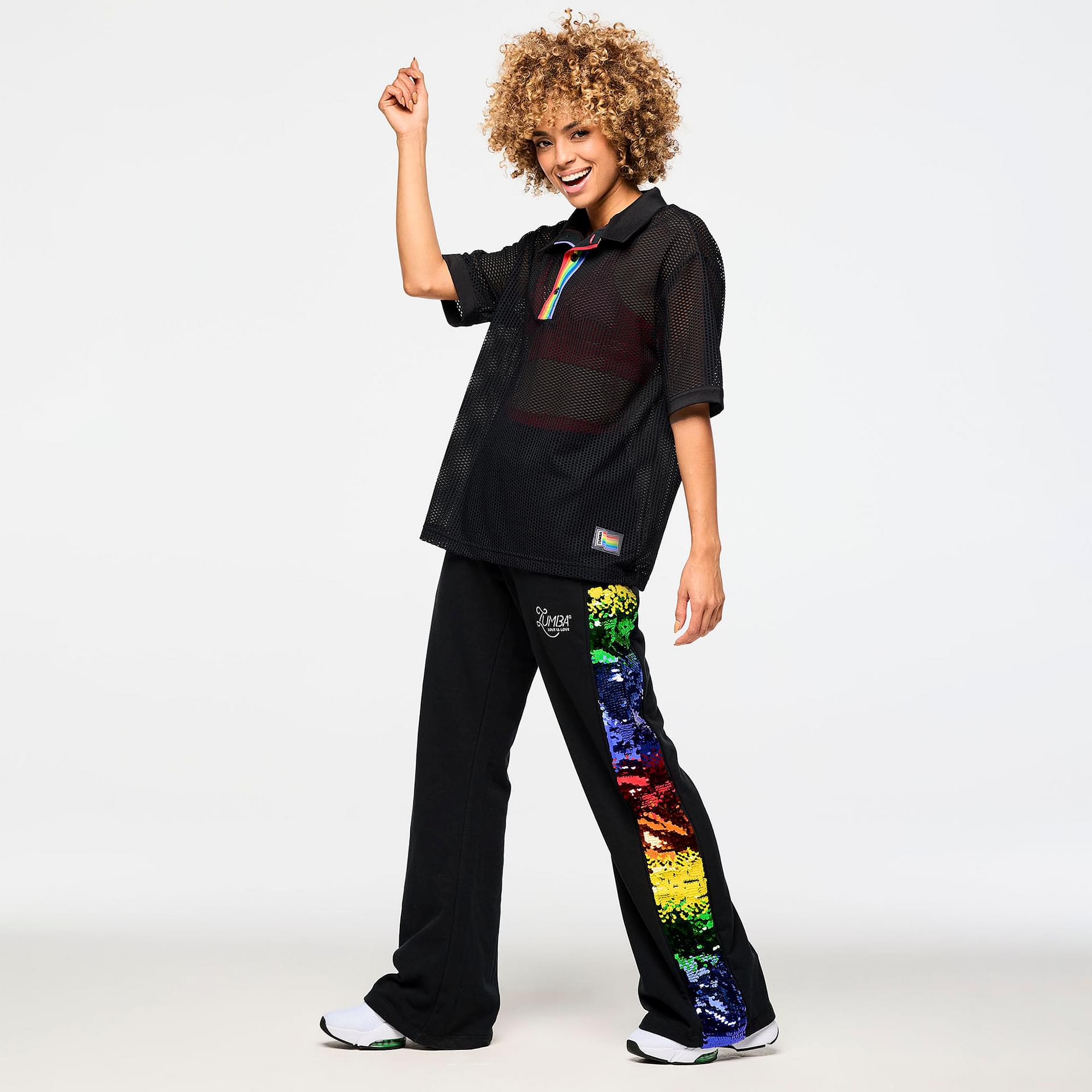 The rainbow striped placket serves as a vibrant accent, reflecting the joy and energy that Zumba embodies.