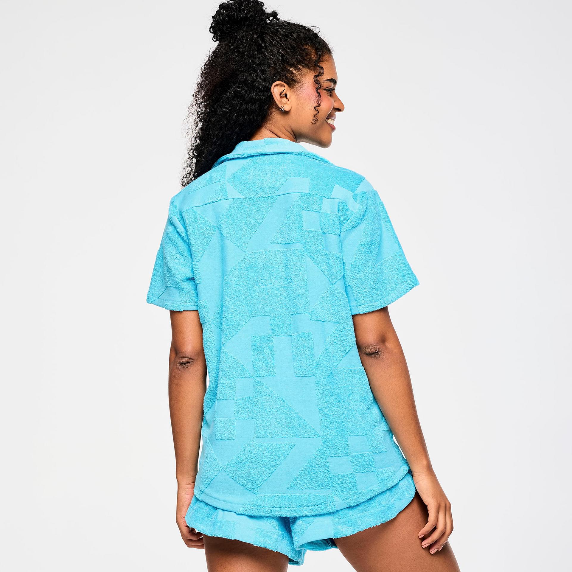 Whether you're engaging in a high-energy Zumba class or enjoying a casual day out, this versatile button-down shirt is your go-to choice. The breathable terry knit fabric allows for optimal airflow, keeping you cool and comfortable during your most intense activities. With front buttons that provide ease of wear, you can effortlessly transition from workout to relaxation.