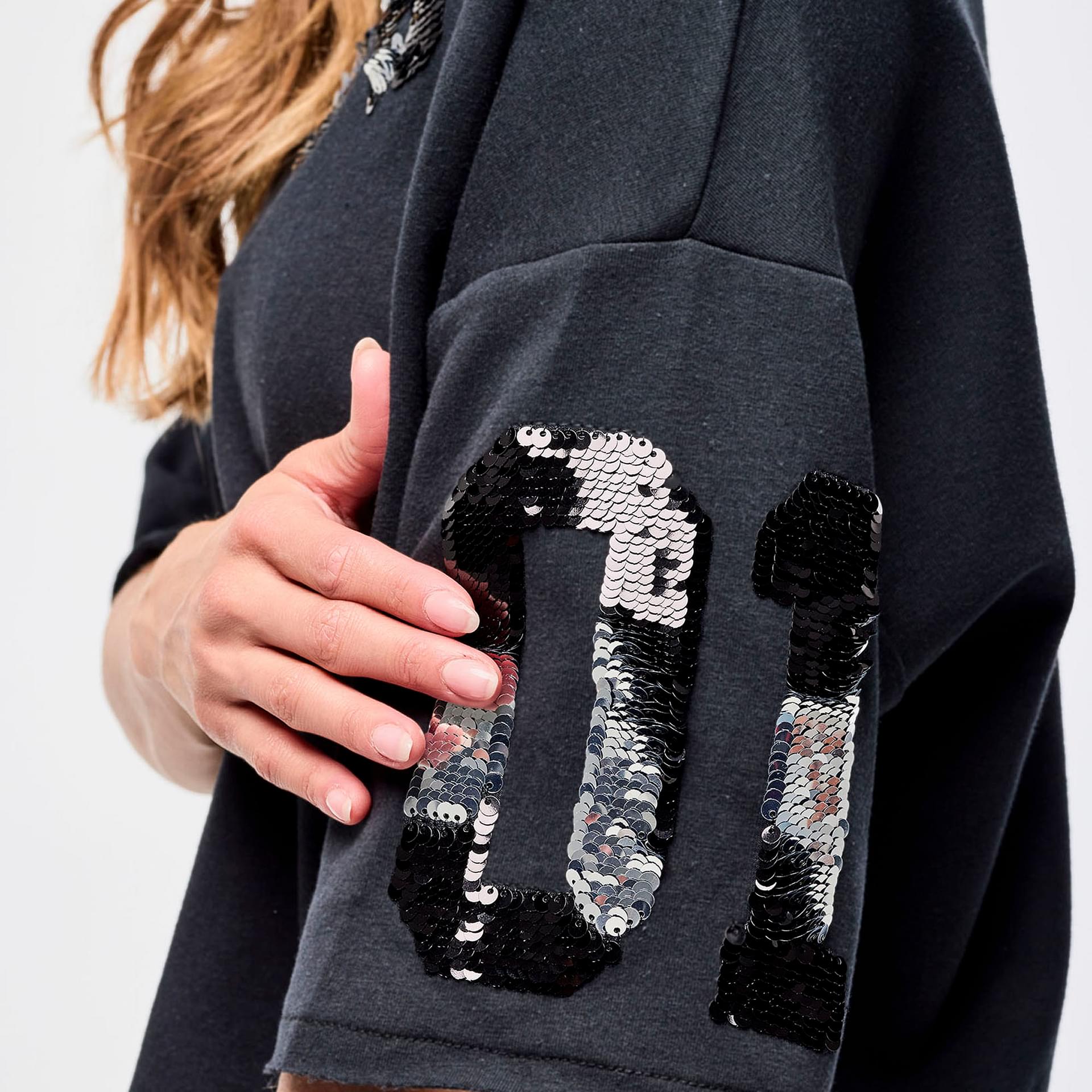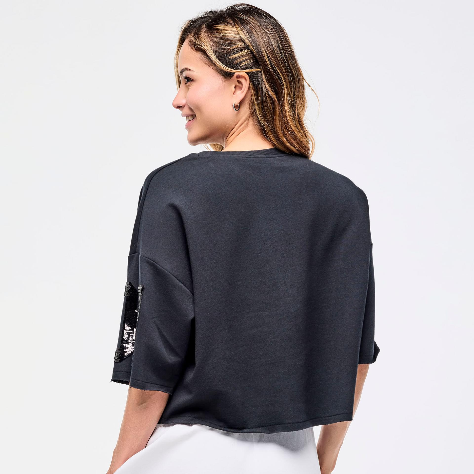Featuring a unique raw edge along the sleeve and bottom openings, this crop top exudes a modern, edgy vibe that sets it apart from traditional activewear. The multidirectional sequined artwork adds a touch of sparkle and personality, allowing you to switch between a bold black and a shimmering silver look with just a push. This versatility not only enhances your style but also reflects your multifaceted nature.